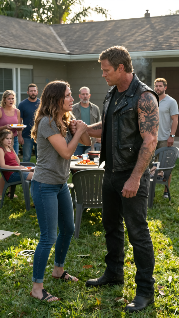 In the minutes that followed, the family began to move again, but their actions revealed where their loyalties truly lay. They gathered around my father, offering comfort and assistance, speaking in hushed tones about what had just happened as if it were an unprovoked act. My uncle guided his friend toward the driveway, his expression tense and uncertain, caught between the expectations of his family and the reality of what had taken place. The biker did not resist or argue, and he did not carry himself with pride or defiance.