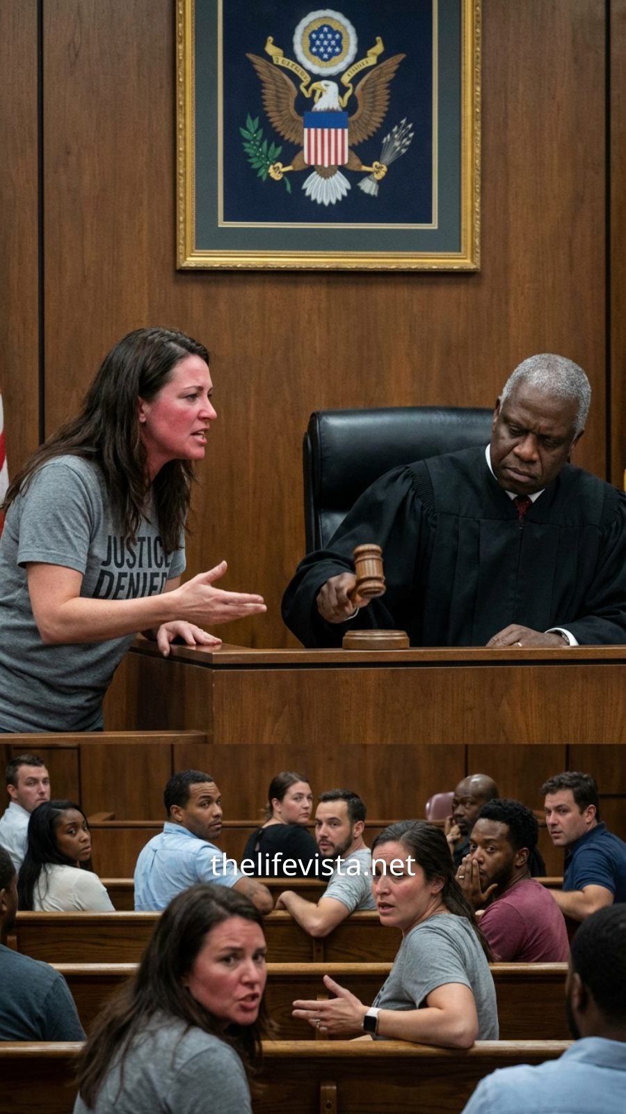 A plain white T-shirt, but across the front, four bold black words stretched unmistakably wide—words the bailiff immediately tried to shield from view. It was too late. Everyone had already seen them. The message was intentional, worn like a badge of provocation. Samantha let a slow smirk form as she scanned the room, her gaze settling with sharp precision on the bench where Judge Theodore Grant, a Black man in his early sixties, watched her with steady, unreadable composure.