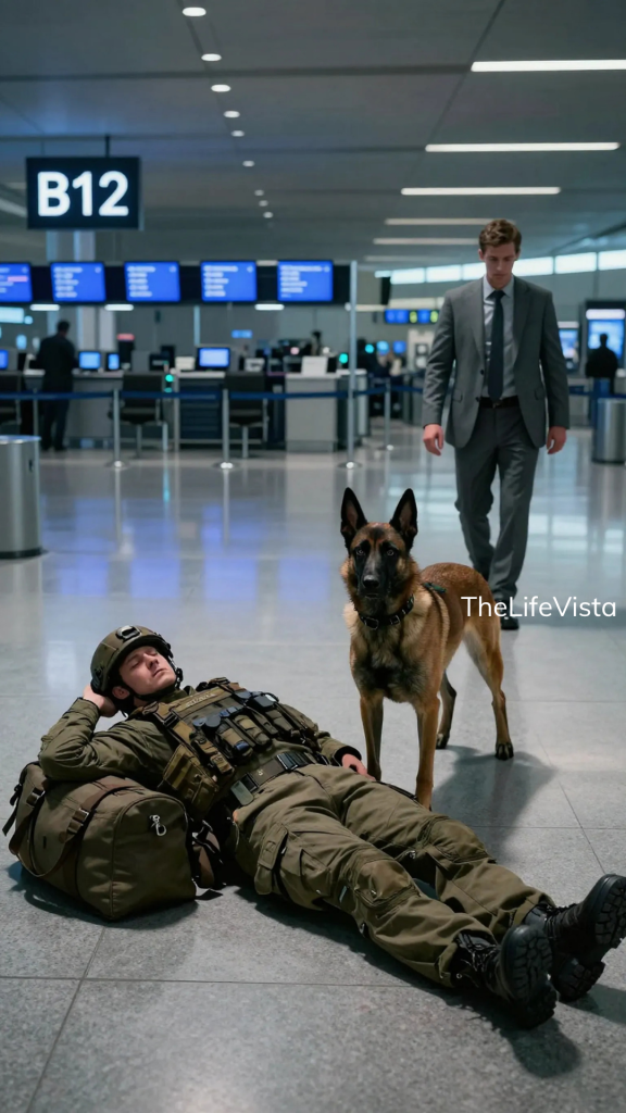 To the public, the scene that followed appeared almost tender. The soldier sat up, rubbed his face, and scratched the dog behind the ears as if waking from a hard-earned nap while his loyal partner stayed close. More pictures were taken. More videos were uploaded. The internet decided that the dog had sensed stress, or protected his exhausted handler out of devotion, or simply refused to leave his side because love had trained him better than any command. Elias did not correct any of it. He gathered his bags, clipped the leash properly into place, and moved through the terminal as though nothing unusual had happened at all.