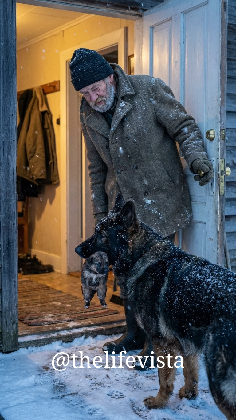 He swung the door open into the blinding white fury of the blizzard, ready for anything. And then he saw her: a German Shepherd, black and gold, fur matted with ice, eyes sharp but exhausted. In her jaws, she carried something small, fragile, trembling.