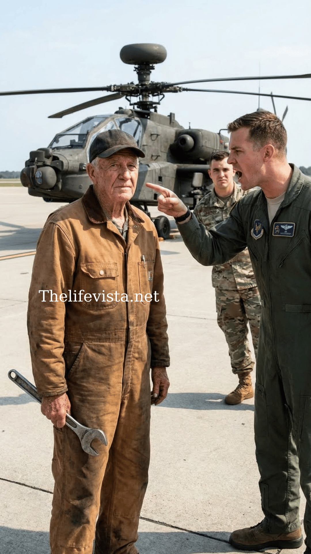 This old man, Theodore Brewer, seemed unfazed by the heat, the roar of distant jets, or the raw scorn in the young officer’s voice. He was a relic, clad in faded, grease-stained coveralls that had seen better decades. He simply looked at the silent beast before them—an H-64 Apache.