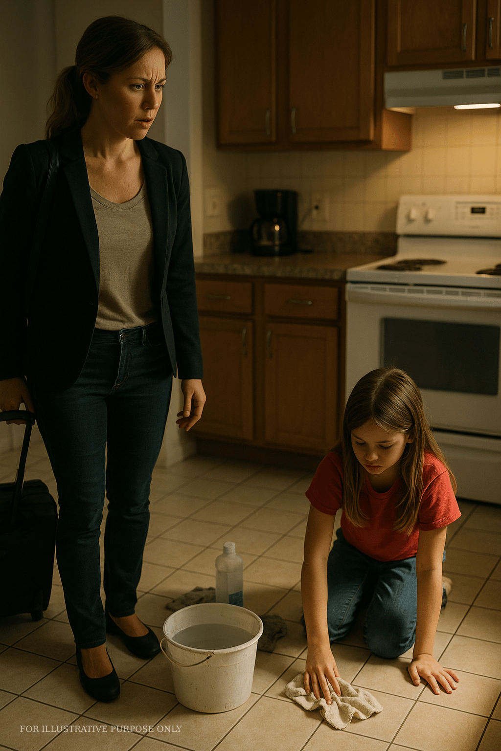 Karen’s gaze swept over the scene — the half-scrubbed floor, the bucket of gray water, the sponge too big for her nine-year-old hands. Her stomach dropped.