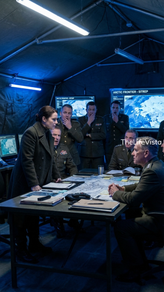 The tent rose like a portable cathedral, all steel ribs and heavy canvas, heater vents roaring at the corners, but the cold inside it had nothing to do with temperature. It was the colder thing—human distance, deliberate and polished. Brass nameplates lined the central table. Screens glowed with satellite maps of the Arctic missile-defense grid. Red indicators blinked in tight clusters, anxious as warning stars.