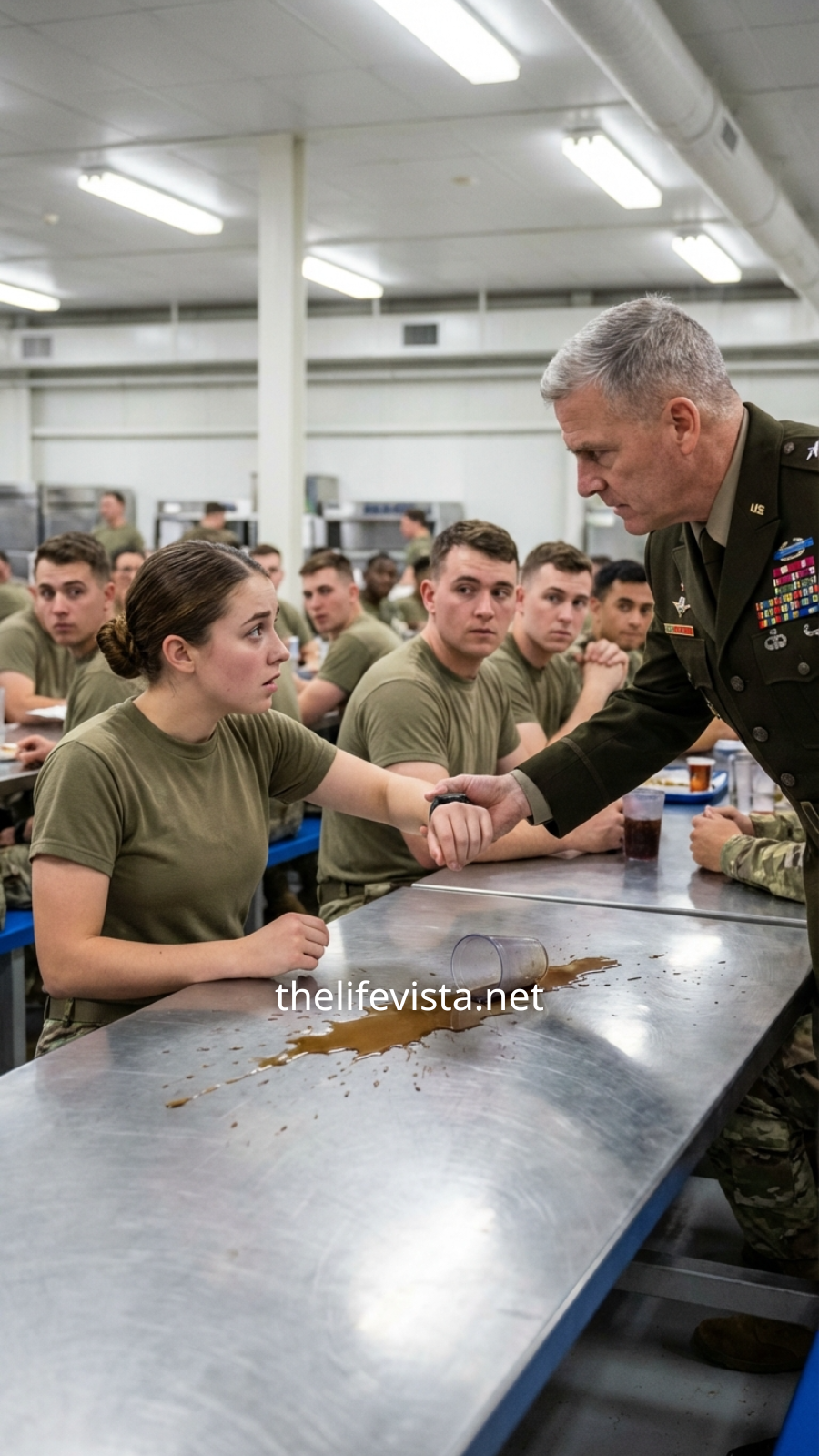 The mess hall at Fort Redwood stretched wide and cavernous, the air thick with the harsh scent of industrial cleaners and overbrewed coffee. Beneath the relentless buzz of fluorescent lights, three hundred soldiers ate in a low, steady murmur, boots scraping faintly across polished tile, cutlery clinking in a dull, constant rhythm.