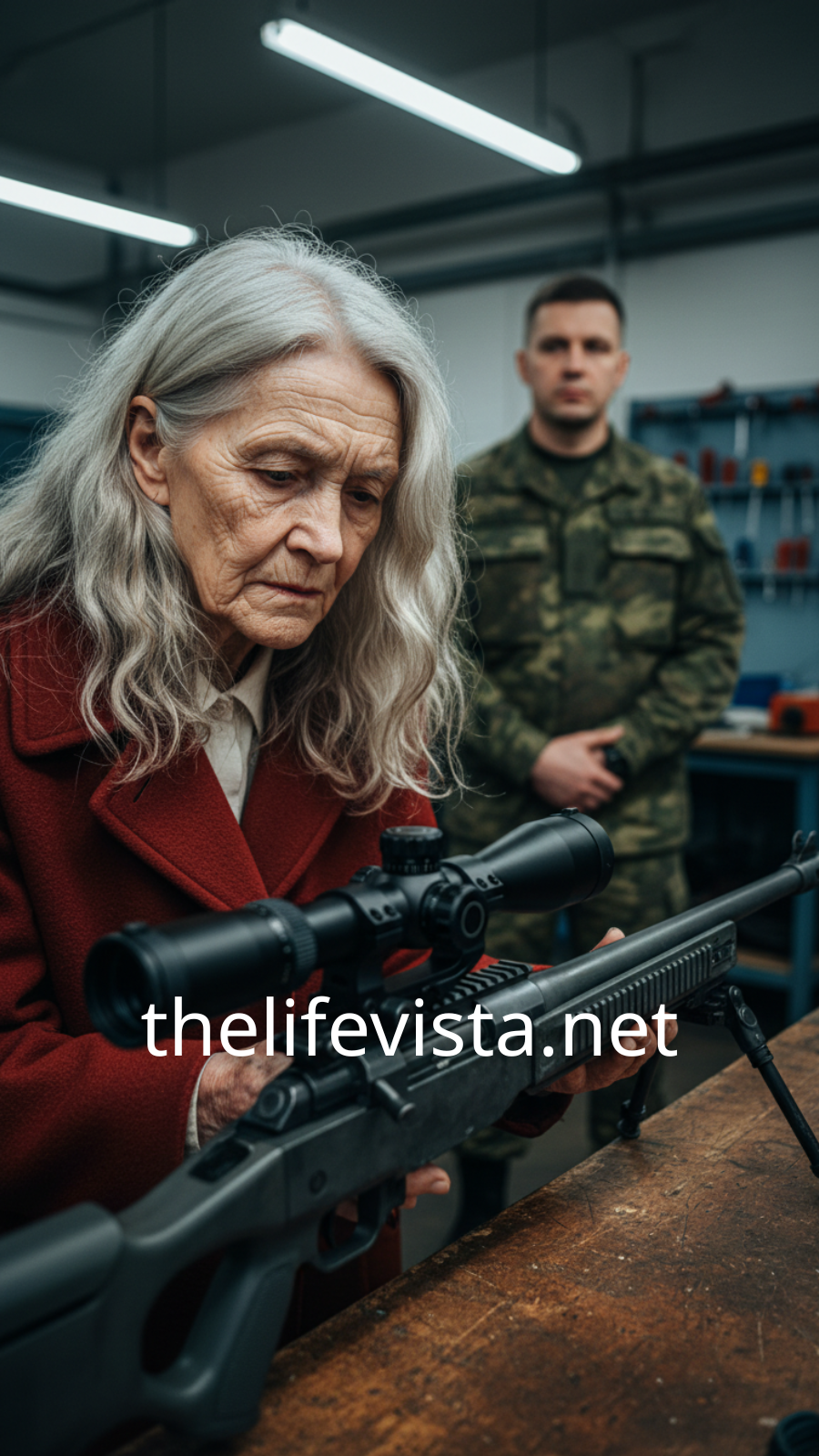 Her long silver white hair was pulled back in a simple, elegant knot at the nape of her neck. She wore a bright red tweed jacket, the kind you might see at a university lecture, not on a dusty army rifle range at Fort Liberty. Her hands resting near the trigger guard were weathered, the skin thin over the knuckles and marked with the faint brown spots of age.