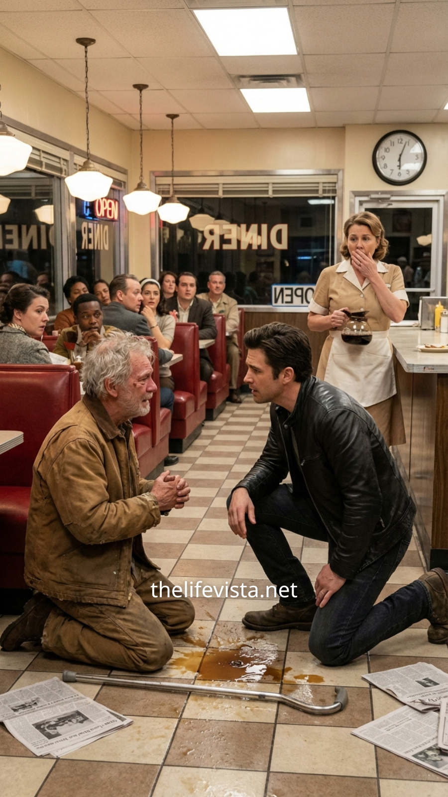 Ernieâs fingers finally wrapped around the dark wood of the cane. He didnât rise immediately. He stayed there, balanced on one knee, breathing slowly through the pain, letting it settle instead of fight it. His gray eyes movedânot randomly, not weaklyâbut with purpose. He noted the exit. The positions of all five bikers. The reflections in the dinerâs polished aluminum panels that showed the street outside. He wasnât searching for escape.