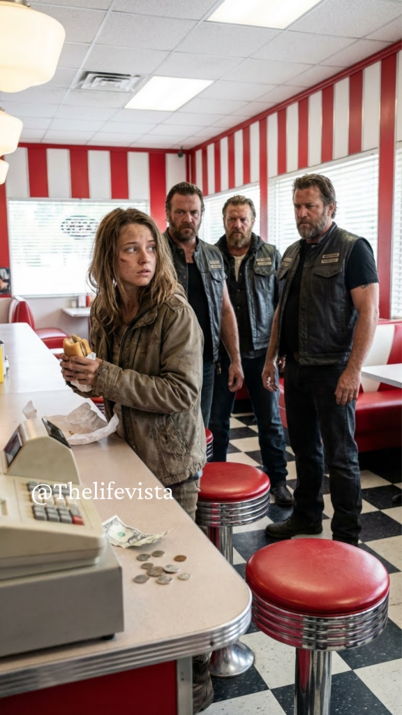 See, I can pay. She smoothed the bloody bills on the counter like they were precious, like they were the only thing keeping her alive. I can pay, she said again, her voice breaking. At the corner table, six men sat in cycling gear, coffee cups, half empty morning ride interrupted by the weather. They wore matching jerseys, Iron Wheels, Veterans Cycling Club.