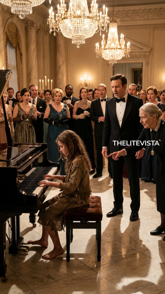 The grand piano stood at the center of the room, black and gleaming beneath the chandelier. The girl approached it without hesitation. She climbed onto the bench, her small hands resting briefly in her lap.