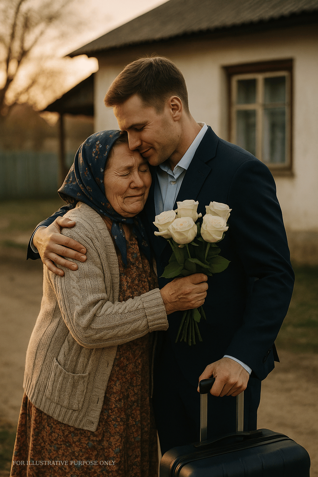 Her tears flowed freely now, and she clung to him as though afraid he might vanish. He smelled of cologne, of city air, of everything foreign and far—but beneath it all she sensed the same familiar warmth, the scent of her child.