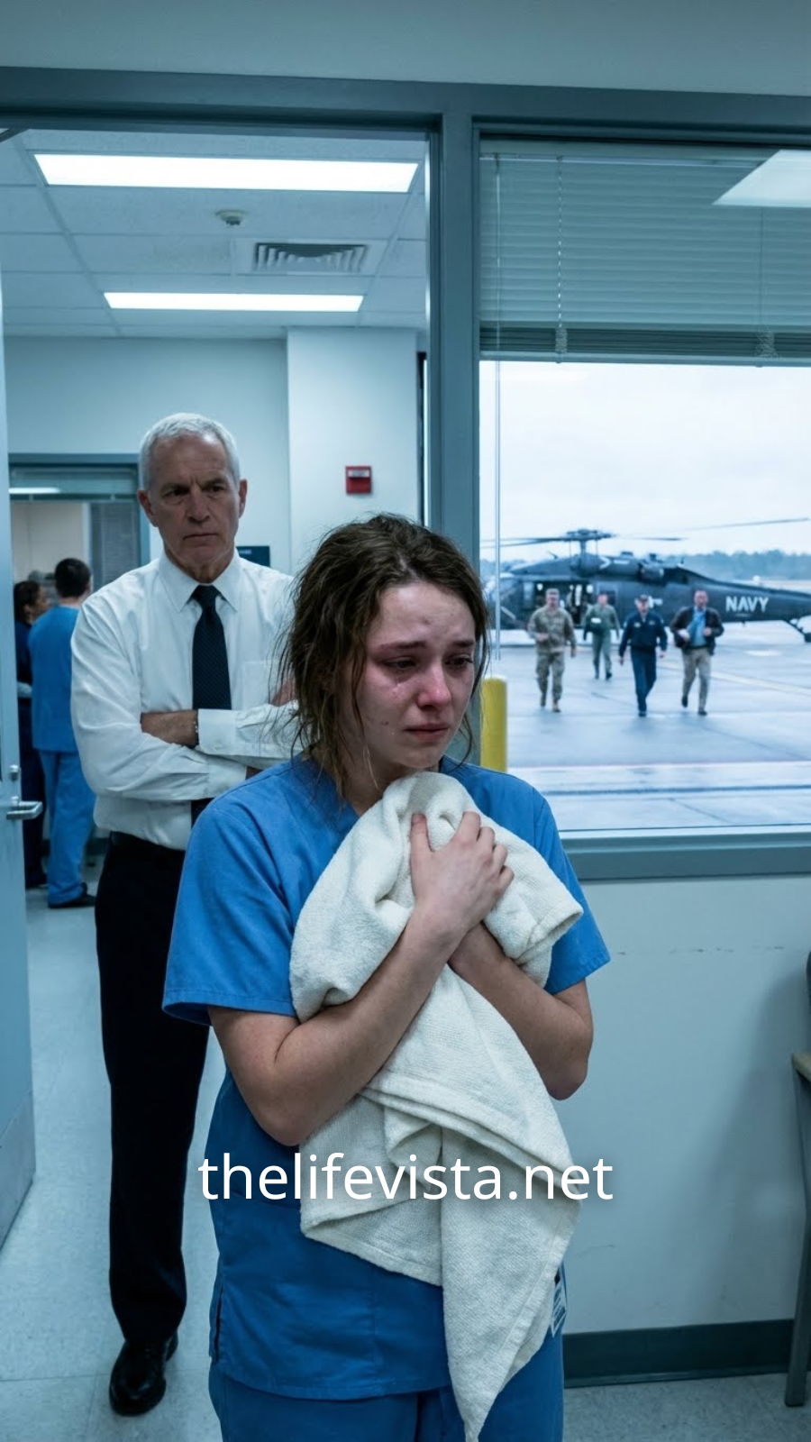 Rain soaked her scrubs as two security officers escorted her up the stairwell—this time not to remove her, but to deliver her to a waiting military helicopter.
