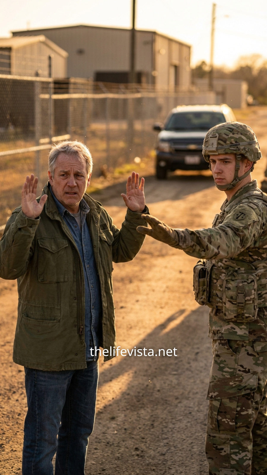 “Turn around, pop,” the MP said, his voice flat, controlled—like polished glass with no warmth behind it. “You’re heading into a restricted zone.”