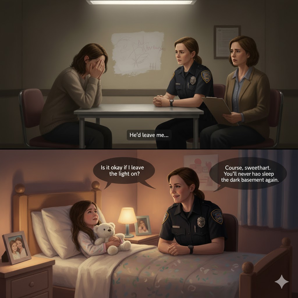 At the police station, Lily clung to Hannah’s hand as if letting go would mean being dragged back to that basement. Her tiny frame shook with every question, but she tried to answer.