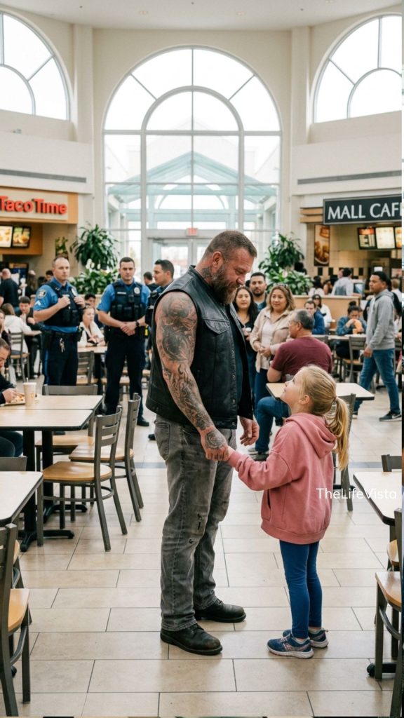 That was when I saw him clearly for the first time, standing out in a way that made people uneasy without knowing why. He was big, broad-shouldered, wearing a worn black leather vest, with tattoos climbing up his arms and neck like a warning sign that someone had written on his skin years ago and never bothered to erase. Next to him stood a little girl, maybe ten years old, wearing a loose pink hoodie with the hood down, her small hand resting quietly inside his much larger one.