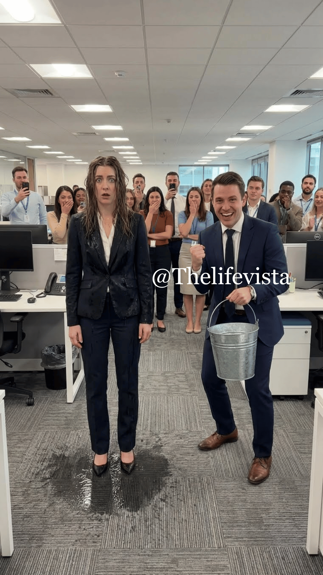 The office fell into a deathly silence. Forty employees watched in horror as Jason approached Emily with the bucket of cold water.