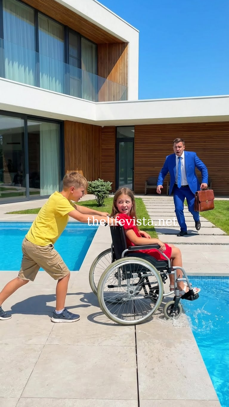 The wheels squeaked a little as he pushed it across the stone tiles, stopping right at the edge of the pool. He glanced down at the water, then back at Sophie. Her eyes were still wide open, watching. He took a deep breath, looked around once more, and without thinking twice, pushed. The chair rolled forward, tilted, and fell into the pool. Samantha’s scream broke the silence. She had just stepped out onto the patio and had seen it happen. Ethan heard the noise and ran outside in terror.