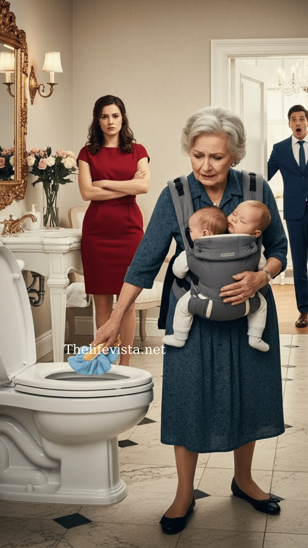 Please, just let my back rest for one minute, whispered Eleanor Carter as her trembling hands pressed against the icy marble floor. She knelt in the master bathroom of her son’s mansion, scrubbing the tile behind the toilet, a place she should never have been, not at her age. Not with bones that cracked like dry branches every time she bent. Strapped to her back were her twin grandchildren wriggling and crying, their tiny bodies weighing down her fragile spine until it felt like something inside her might snap. The sharp smell of bleach stung her nose, mixing with the salty sweat running down her temples. Every stroke of the sponge was a battle against pain she no longer had strength to hide.
