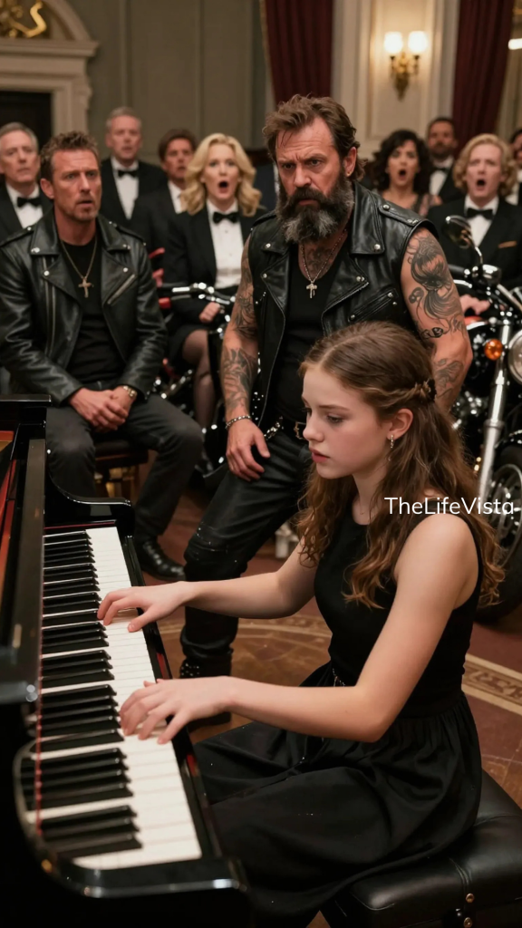 Her name was Sofia Calder, and at sixteen she had already learned how to make herself seem smaller around privilege without losing the fire that drove her hands across a keyboard. She wore a black dress purchased secondhand and altered carefully by her mother, and she understood all too well how different she looked beside classmates whose families funded private instructors, imported instruments, and European summer programs. When she glanced through the conservatory’s front window that evening and saw a line of motorcycles pulling up beneath the lamplight, her stomach dropped so hard it nearly felt like pain. One by one the riders entered beside her grandmother, leather and denim crossing a lobby built around silk and pearls. Conversations died in stages. Security guards looked unsure whether to intervene or simply keep blinking.