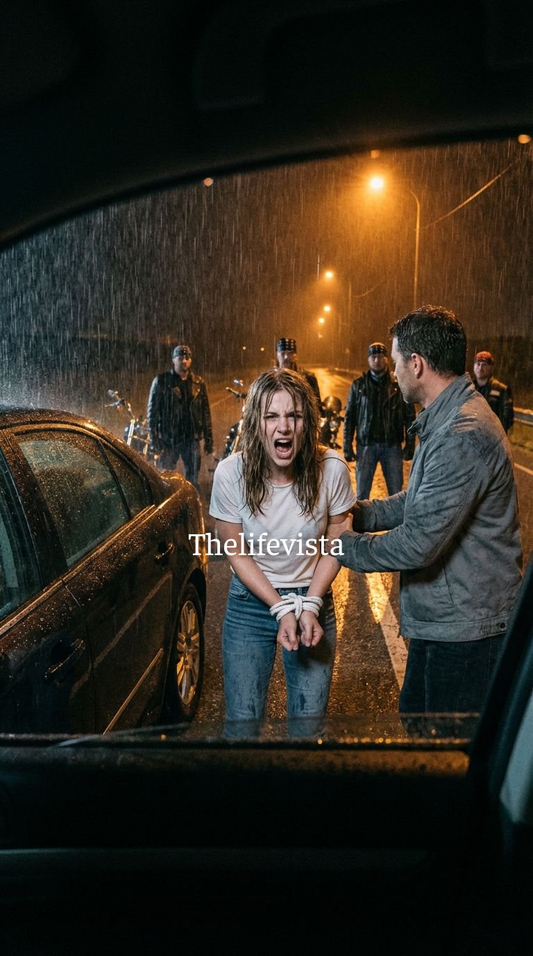 For a brief moment, everything felt suspended — the storm, the flickering light, the SUV door hanging open like an unfinished sentence.