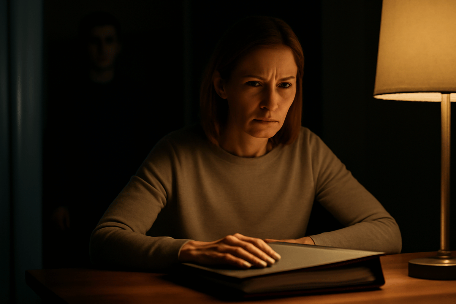 He came closer, leaning over her shoulder. She could smell his mother’s perfume — that heavy floral musk she detested. That scent always arrived before a storm.