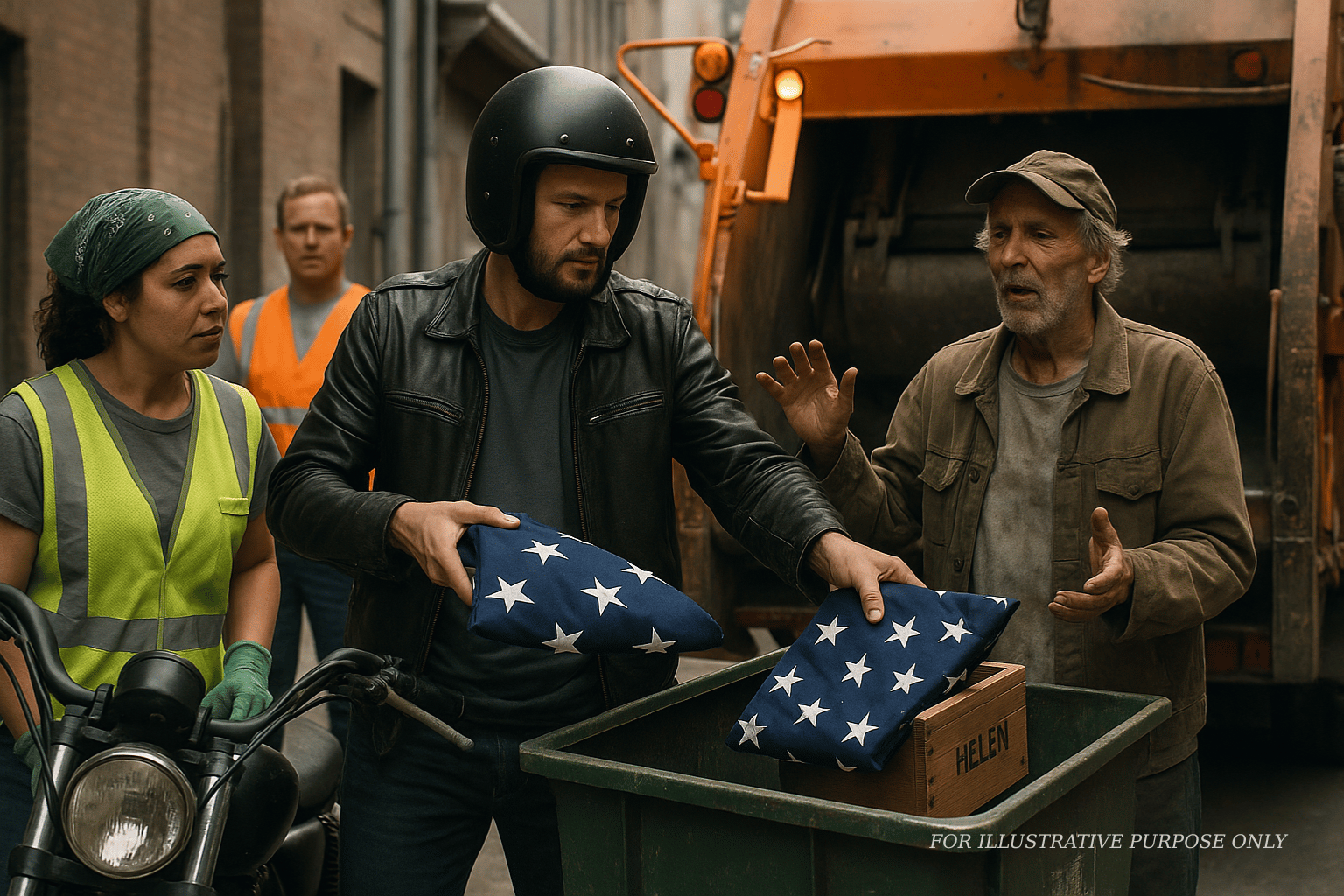 But in the bin, just at the edge of being crushed, I caught sight of something that made my chest tighten: a folded flag, precise and deliberate, its blue field pressed tight, white stars forming a map of memory. Next to it lay a small wooden box, its lid etched with a name burned into the grain.