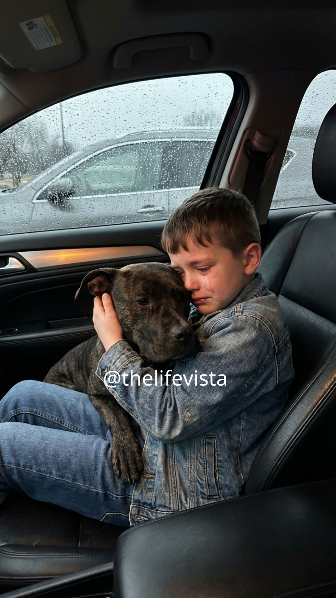 Sitting right next to him, taking up the entire passenger seat, was Tank. Tank was my brother’s rescue dog, a colossal mastiff mix with a missing chunk in his ear and a face mapped with old scars that made him look like he had survived a war no one had bothered to write down. Normally, Tank looked absolutely terrifying, the kind of dog that made delivery drivers hesitate at the gate and made neighborhood kids stare from a careful distance. But right now, this massive beast was gently resting his heavy chin over the little boy’s legs, letting out a low, soothing hum from his chest and keeping the boy pinned in a comforting, weighted embrace with the kind of instinctive tenderness that no one would ever have guessed from his ruined face.