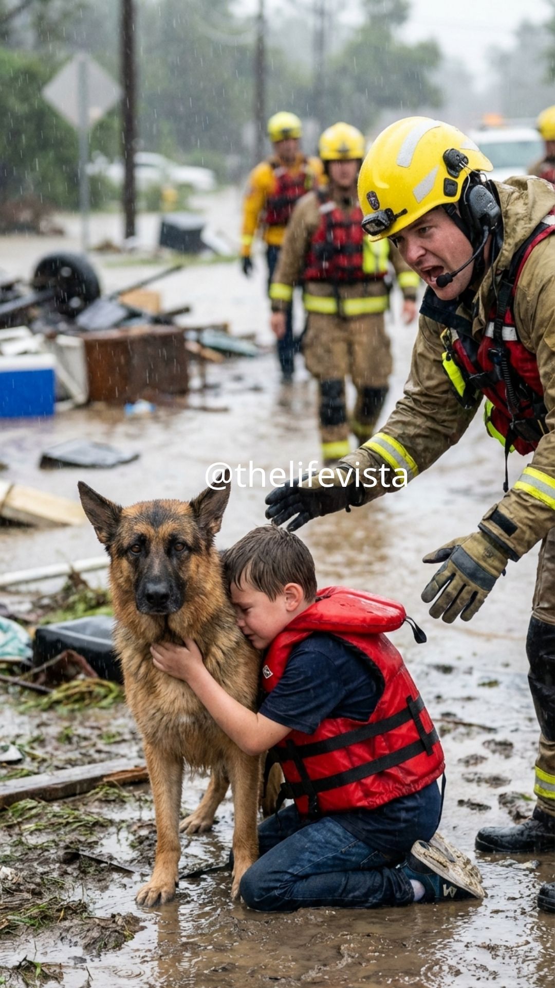 Later, when the storm loosened its grip and the helicopter touched down at a triage center set up in the high school gymnasium of the neighboring town, the story began to unravel in fragments. Caleb had been crossing the old pedestrian bridge with his mother when the supports gave way under the pressure of debris piling against them. She had managed to scramble onto a floating doorframe and had been rescued earlier by a separate team, believing her son had been swept too far downstream to survive. Scout, a mixed-breed shepherd Caleb had adopted from a local shelter the previous year, had been with them and somehow navigated the current to reach the boy when he became pinned beneath the log. By the time those details were pieced together from interviews, dispatch logs, and witness accounts, the people hearing them no longer reacted with simple surprise but with the quieter, more reverent disbelief reserved for acts of loyalty so pure they seem almost impossible.