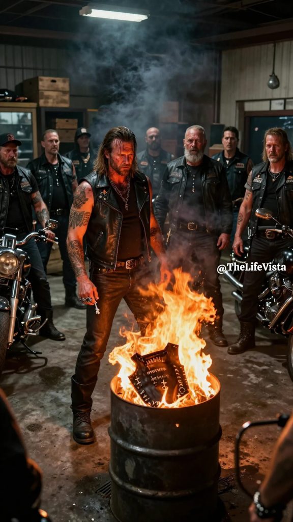 The instant Dorian Voss dropped his own biker vest into a steel barrel full of fire in front of fifty motionless club brothers, the entire garage seemed to stop breathing. No one shifted against the motorcycles lined up along the concrete walls, and no one on the wooden crates dared stand or speak. Even Gideon Shaw, the club president, a man whose years on the road had made him look unshakable, remained perfectly still beneath the wash of orange light. Flames snapped and hissed inside the rusted barrel, and their reflections trembled along chrome pipes and polished tanks like little strips of broken fire.