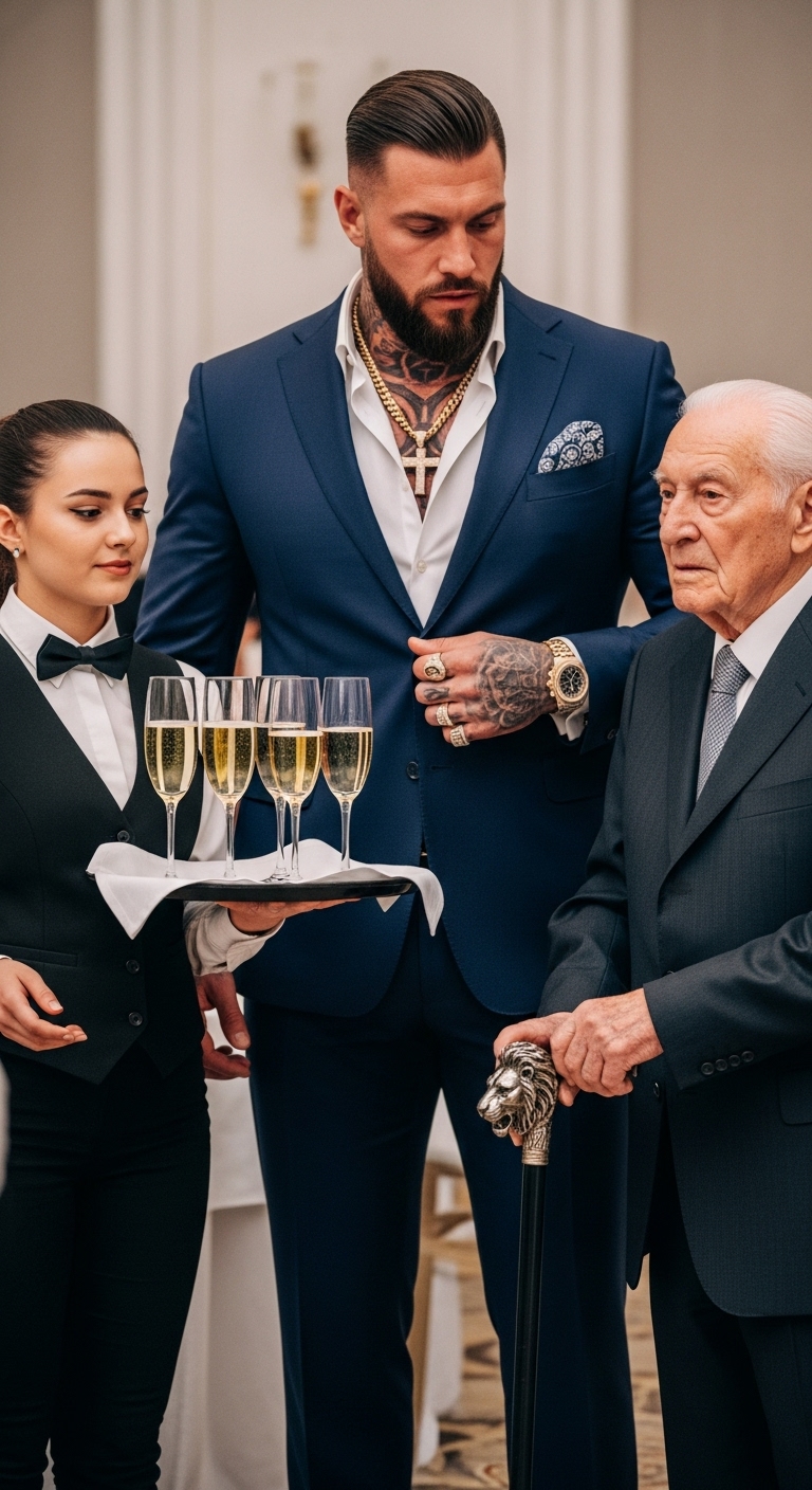 It started like a ripple through water — whispers cutting off mid-sentence, laughter dying abruptly. I turned just as an older man entered, leaning on a silver lion-headed cane. His presence alone commanded the entire room. He was dressed impeccably, a black suit perfectly tailored to his lean frame. His face, weathered yet regal, belonged to a man who had survived wars — and perhaps started a few of his own.