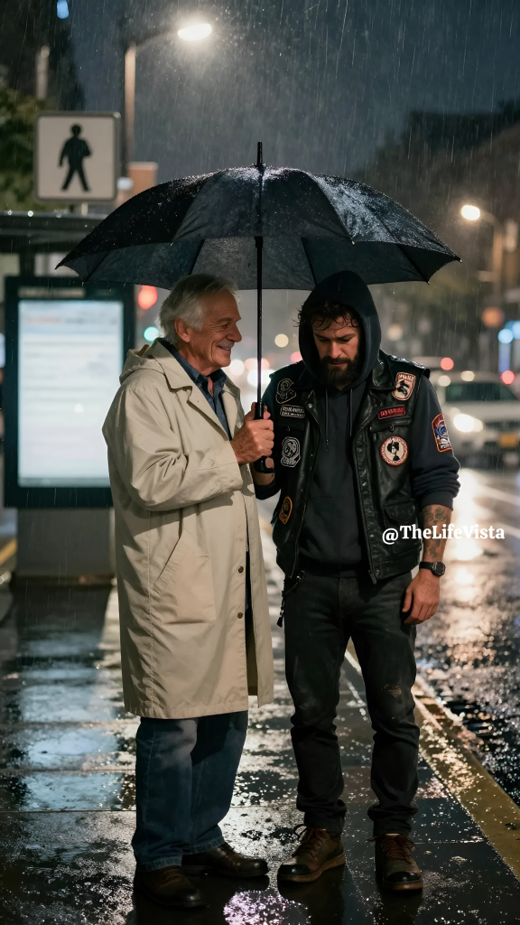 “Rook,” the biker replied, shifting his weight slightly under the umbrella. Neither man felt any need to fill the silence immediately afterward. They simply watched the rain paint silver streaks across the pavement. The quiet felt comfortable rather than awkward.