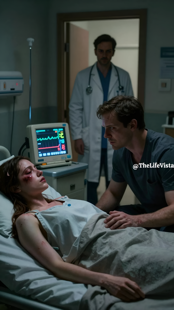 The doctor who stepped into the room did not enter with the bland neutrality I had grown used to from emergency staff who were too rushed or too cautious to see what was in front of them. He came in with a tablet tucked under one arm and a face that had already made up its mind to examine the truth rather than the performance. Dr. Rowan Vale did not address my husband first, and that detail alone made something inside me stir. He looked directly at me. He looked at the bruises blooming across my arms and collarbone in dark purples and fading yellow-brown patches, the kind of bruises that did not come from one accident on one staircase on one bad night. He looked at the swelling, at the marks on my neck, at the old injuries layered beneath the new ones, and he saw pattern where other people had accepted explanation. Then he turned to the man beside me and said, in a voice so even it became its own form of force, that he needed him to step outside for a neurological assessment because that was hospital policy for head trauma. My husband, whose name was Gavin Mercer, tightened his grip on my hand just long enough for me to feel the threat in it before he released me. He tried to smile, but the mask slipped at the edges. He said he was not leaving because I needed him there. Dr. Vale did not argue. He simply repeated that this was not a request, and when he angled his head toward the doorway, two security officers appeared as if they had been waiting for that exact signal. Gavin’s expression hardened for an instant, and I saw the familiar flicker of rage slide beneath his skin. Then, because he had always been skilled at calculations, he stood, gave my fingers one last theatrical squeeze, and walked out as if he were the one being wronged. When the door shut behind him, the silence in the room changed. It was no longer the silence of fear alone. It felt heavier than that, charged and waiting, like the atmosphere before lightning splits open a summer sky. Dr. Vale came closer, lowered his voice, and told me plainly that the scans showed broken ribs in different stages of healing, an older nasal fracture, fresh trauma around my orbital bone, and bruising patterns no staircase could account for. He said it without melodrama, without pity, without softening the truth to make it easier for me to hear. He asked me if I understood that. My pulse climbed so quickly that the monitor began to answer for me, its rhythm turning frantic under the strain of panic. I looked toward the closed door because every instinct in me insisted Gavin would burst back in, and if I betrayed him here, he would finish what he had begun in the kitchen. Dr. Vale must have seen the terror shift across my face because he leaned one hand against the bed rail and told me that if I told the truth, there were people in that building who would make sure Gavin never touched me again. He said he needed my voice. He said I was the one who had to break the lie. I looked at him, and for the first time in years I felt something other than dread moving through me. It was small and painful and hot. It was the first spark of revolt.