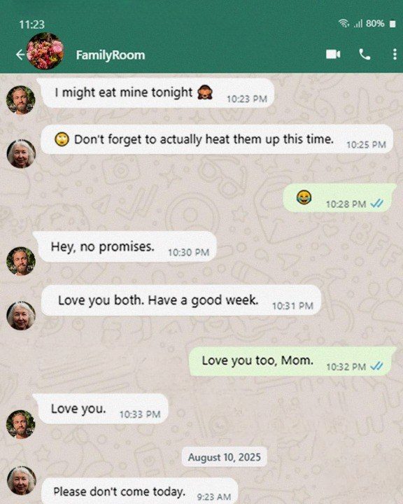 “Dinner next Sunday. 6 p.m. Bring tupperware. And maybe a hug.”