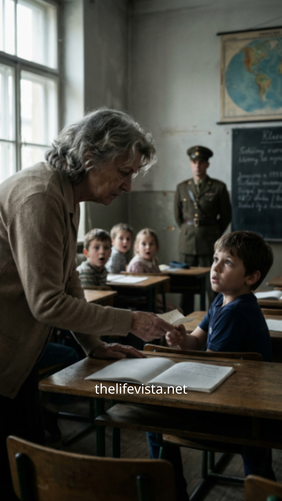 Suddenly, Mrs. Whitmore appeared beside Lucas’s desk. Her shadow fell across his paper, blocking the light. She leaned down, reading over his shoulder.