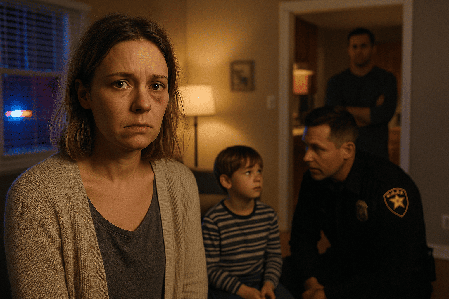 The flashing red and blue lights washed over the Carter living room like bruises made of light. The air smelled faintly of whiskey, sweat, and broken promises. Emma Carter stood near the doorway, her breath shallow, her left cheek swelling where Ryan’s hand had found her. The crack in the photo frame on the floor cut across the smiling faces of their wedding day.