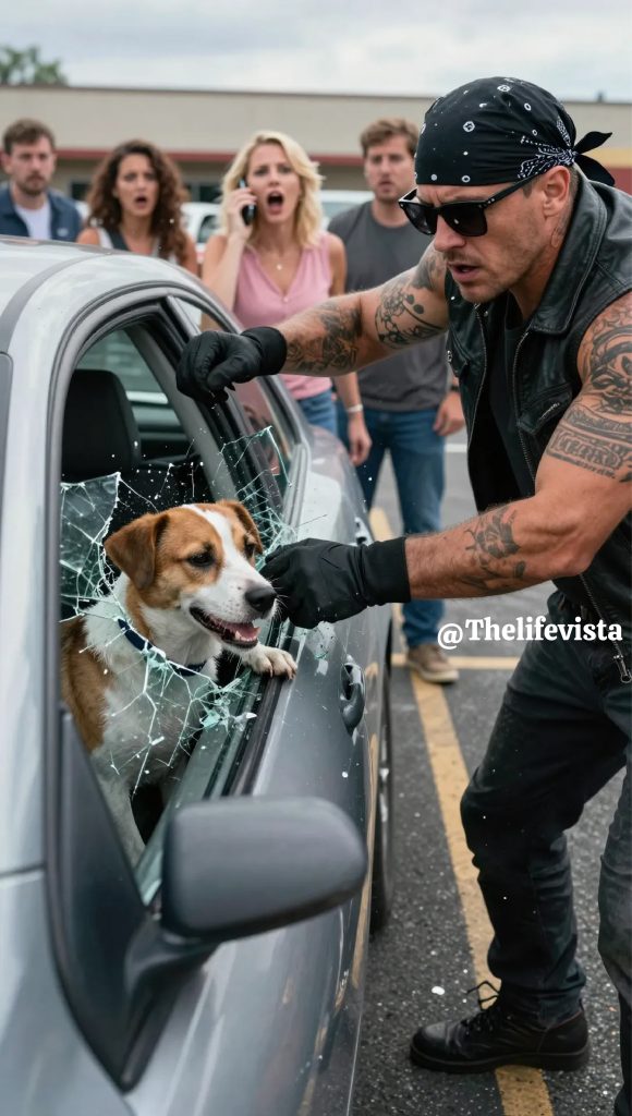 Sirens wailed in the distance, growing louder until a cruiser rolled into the lot. Officers stepped out, hands near their belts, eyes moving from the shattered glass to the dog to the biker holding it.