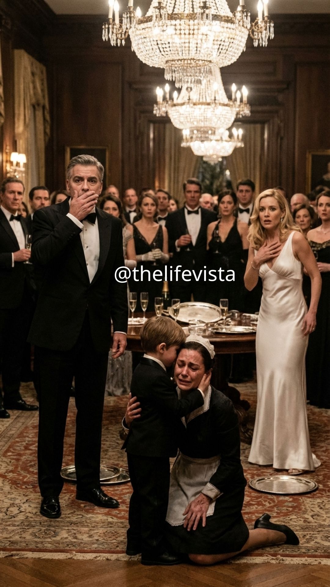 Still kneeling, scrubbing glove pressed against the floor, Isabel Cruz slowly looked up and met the child’s eyes, and whatever color had been in her face drained instantly as if she had just been confronted by a ghost from a life she had spent years trying to survive rather than remember. She glanced desperately toward the crowd, then back to Milo, as if begging him silently to turn away before something irreversible happened. There was such naked fear in her expression that even the guests, who knew nothing of her story, could feel that whatever was unfolding before them had not begun tonight but long before any of them entered the ballroom.