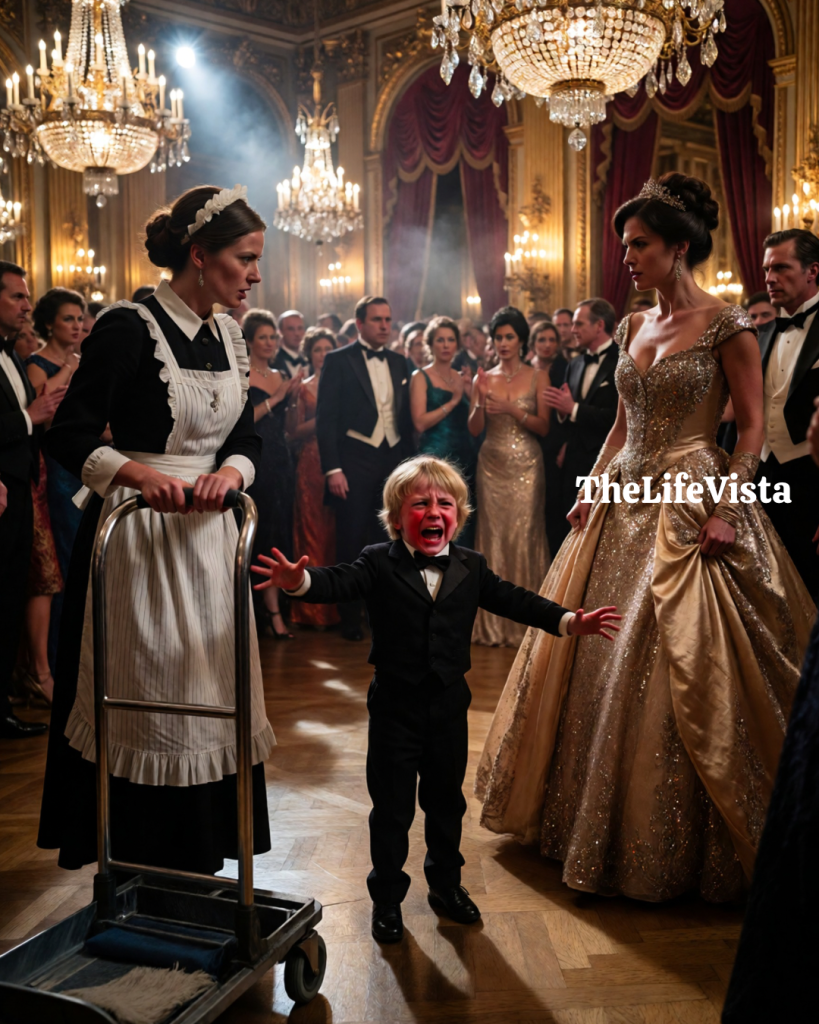 The crystal chandeliers were still shimmering from the last round of applause when the sudden silence swept through the grand ballroom, causing nearly fifty impeccably dressed guests to turn toward the same unexpected scene unfolding across the polished marble floor, where little Adrian Vega, the two-year-old son of a powerful hotel tycoon, was running with flushed cheeks and tear-streaked eyes straight into the arms of the mansion’s maid, his small voice trembling as he cried out the word no one in the room had heard him speak since his mother’s funeral. He wrapped his arms tightly around her legs, burying his face into the fabric of her gray uniform as if it were the safest place he had ever known, and through sobs he repeated the word again, clinging to her as though she were the last anchor in a storm he could not yet understand.