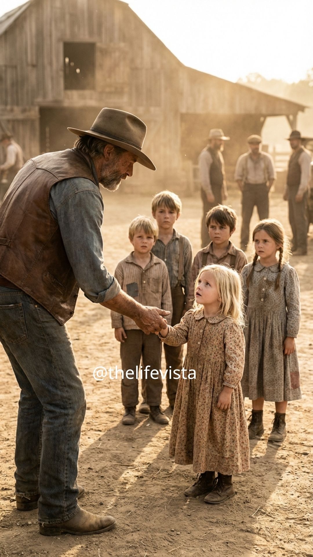 The auctioneer, Mr. Lawson, had a voice built for ordering the world around, the kind that could sell a bull or a piano with the same cheerful cruelty. “Fine breeding stock, gentlemen. Twenty dollars to start,” he called, and hands went up like reflexes. Ethan barely tracked the bids. His mind kept wandering to Olivia’s last day, to the way she’d tried to smile and failed, to the way she’d reached for his hand and whispered, “Don’t turn into stone, Caleb. Stones don’t grow anything.” He’d nodded like he understood, but grief is a language you don’t learn until you’re forced to speak it. A gust stirred the sagebrush smell and brought with it the sour tang of horse sweat and old manure, the bitter perfume of a town that survived by turning need into currency. Then a commotion rippled near the courthouse steps, not loud at first, just a hush that spread like spilled water. Ethan followed the line of people’s stares and saw a woman standing straight as a fence post in a faded dress that had been mended so many times it looked quilted by necessity. Five children held to her in a tight cluster: a teenage girl with serious eyes; two skinny Noahys who stood shoulder-to-shoulder like they’d been Noahrn guarding each other; a little blonde girl hiding behind the woman’s skirts; and a baby on the woman’s hip, fists clenched in the heat.