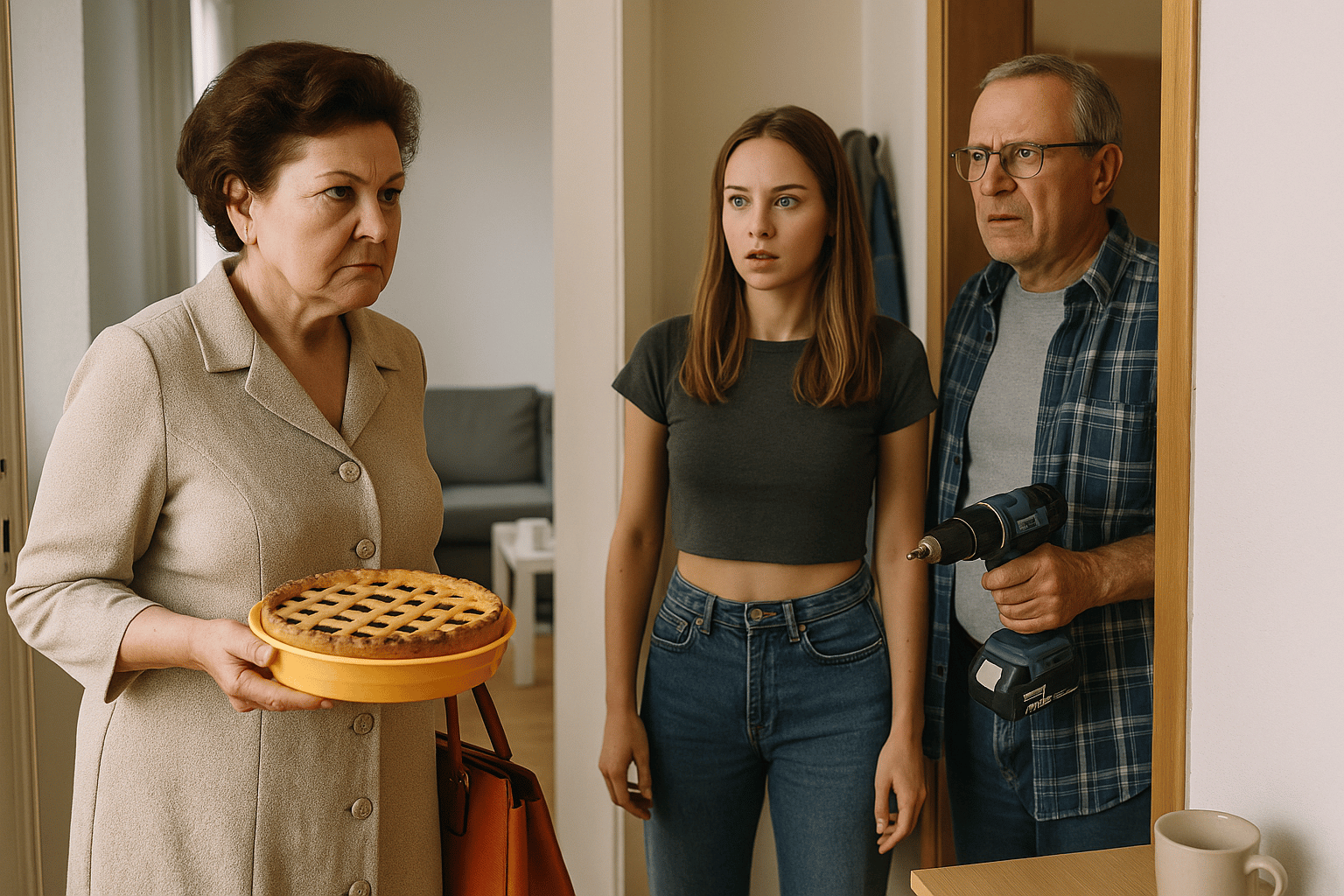 “Don’t worry—I’m not here to catch you in the act,” Galina said, holding out the pie box. “I brought apple pie for Alina. Thank you, dear, for letting my husband feel useful.”