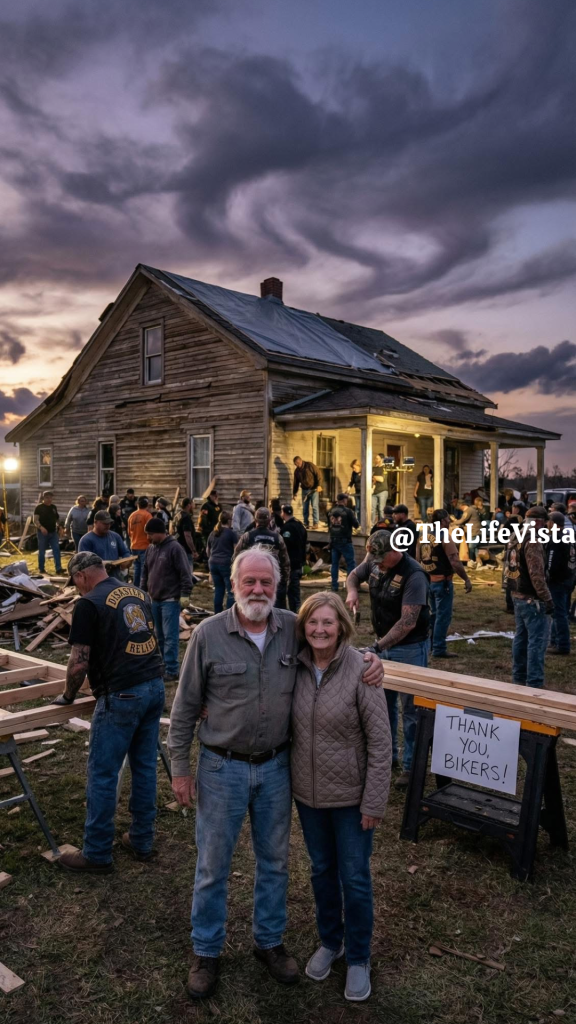 The sound reached Briar Hollow before the dust cloud, a deep vibration that crept into bone and nerve, and when people looked toward the road, they saw not twelve motorcycles but thousands, riders pouring in from every direction, engines rolling like distant thunder. They came with trailers loaded with lumber, generators, food, medical supplies, not weapons, not threats, but tools, and as engines cut and silence spread out of respect, Calder stood before them and told them about an elderly couple who had opened their door when fear ruled the town.