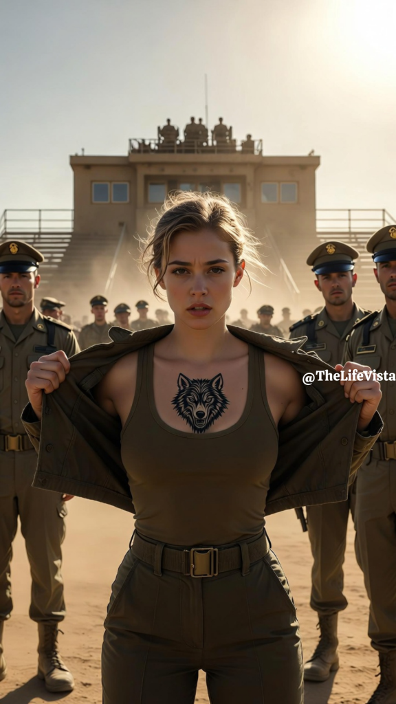 The sound of metal teeth parting seemed impossibly loud. Adrianne removed the blouse with movements so controlled they almost looked serene, exposing the plain olive tank beneath, and as she adjusted her shoulders the tattoo at her back came fully into view. Centered between her shoulder blades was a wolf’s head rendered in dark, intricate lines, jaw open in a silent snarl, ringed by crossed bolts and stars in a pattern no one on that field should have recognized and yet too many did. It was not decorative ink. It was Iron Warden insignia, the covert mark associated with Operation Night Raptor and the compartmentalized personnel who had survived or served under its protocols. The effect was immediate and violent in its silence. Calder inhaled sharply. Sloane went pale. Holloway’s face lost all color as the confidence drained from him so quickly it seemed physical. Soldiers who had moments earlier wanted Adrianne humbled were suddenly staring at something far larger than barracks hierarchy. Sloane was the first to recover enough speech to ask, in a careful voice stripped of all accusation, whether the insignia represented Night Raptor. Adrianne answered in the same neutral tone she had used from the beginning: that such information required security verification before discussion in that setting. Calder turned to Holloway and told him flatly that the matter was now beyond him. Before anyone could attempt recovery, engines approached. Black vehicles cut across the base road and rolled toward the platform with the finality of authority that does not announce itself because it expects to be obeyed on sight. Major General Nathaniel Harrow stepped out first, followed by Colonel Sabine Voss carrying a folder thick with secured documentation. Harrow mounted the platform and fixed Holloway with a look that collapsed whatever remained of the captain’s composure. His first question was not loud, but it carried farther than shouting: who had authorized the public exposure of classified operational markings. Holloway started trying to explain, but Harrow did not let him build a defense from words. He cut him off, stating with terrifying clarity that personnel connected to Night Raptor were compartmentalized under Pentagon-level protocols Holloway had neither the authority nor the access to touch. Then Harrow turned to Adrianne, and for the first time that day any authority in the chain spoke to her as though she were a person rather than a problem. He told her to secure her blouse. She pulled the uniform back on and zipped the wolf out of sight. It felt less like concealment than like closing a door too many had already seen through.