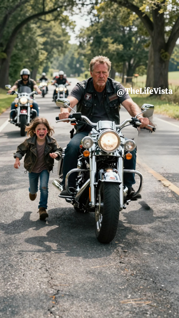 They found her running barefoot along the empty country road, her pale pink dress smeared with mud, torn at the hem, her small voice breaking through the quiet forest like a cracked bell. Her legs shook as she chased the thunder of approaching motorcycles, breath tearing painfully through her chest, lungs burning with every step. The words she screamed were enough to chill the blood of even the hardest men riding that day.
