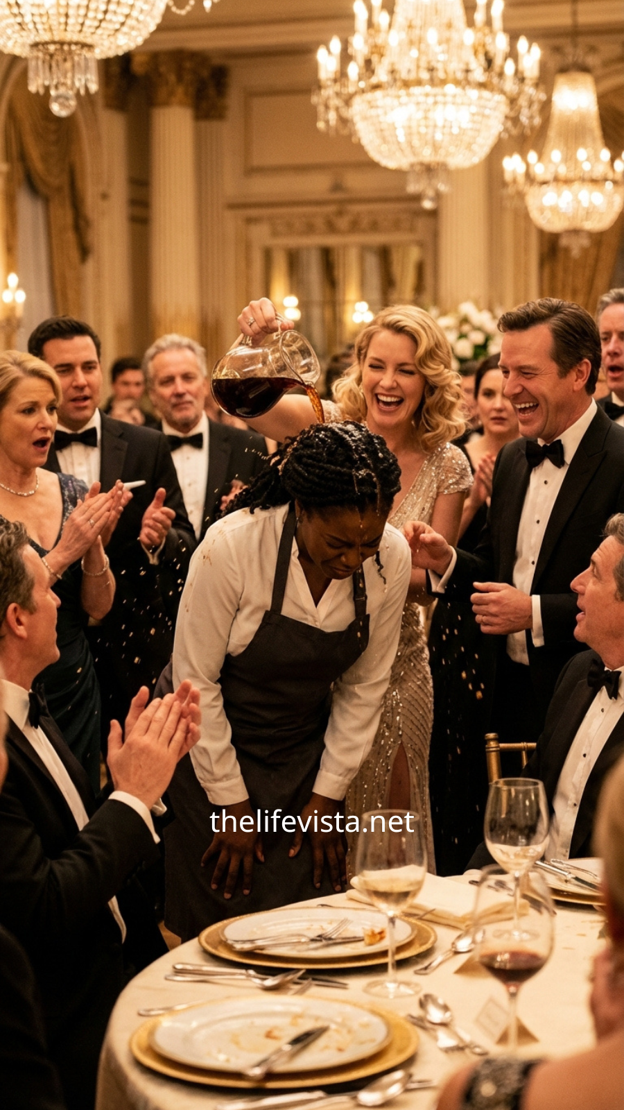 Before I could even step back, Celeste tilted her glass toward me. The deep red wine spilled forward, splashing across my apron and soaking into the fabric of my blouse beneath. A few nearby guests gasped softly. Celeste covered her mouth in mock surprise, but her eyes gave her away, sparkling with quiet amusement.