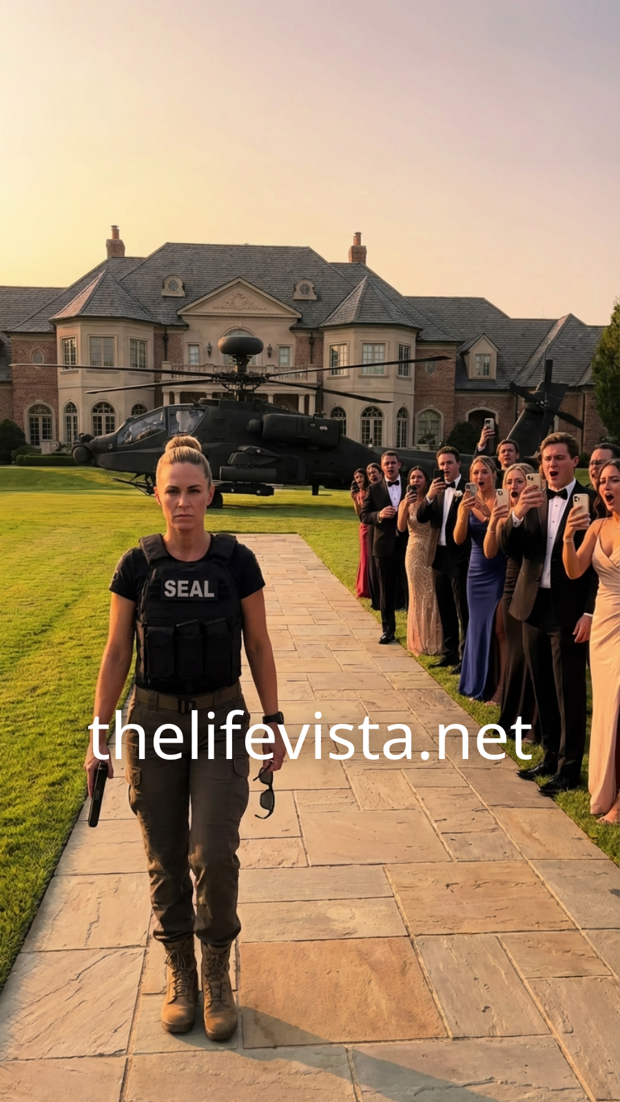 A deep, thunderous sound rolled over the estate as an AH-64 Apache cut through the night sky, its lights slicing across the manicured lawn. Conversations stopped. Glasses froze midair. Guests rushed to the windows as the helicopter descended with flawless precision, landing on the grass in a storm of wind and sound.