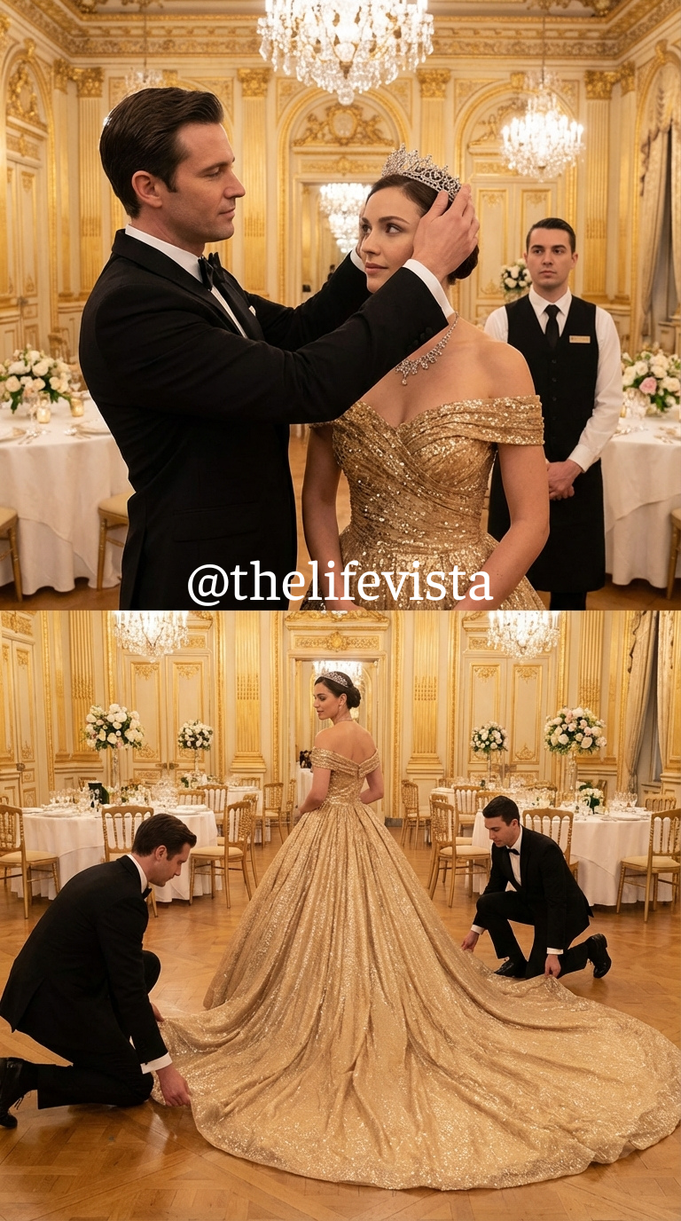 THE REVEAL Maya slowly removed her apron. Under the maid’s uniform, she was wearing something else. She took off the white blouse and black skirt. Revealed beneath was a gold silk gown, designed by a famous Parisian designer, shimmering under the lights. She untied her hair, letting it fall—long, glossy, and regal. A bodyguard opened a box. Inside was a diamond necklace and a tiara. They placed them on Maya.