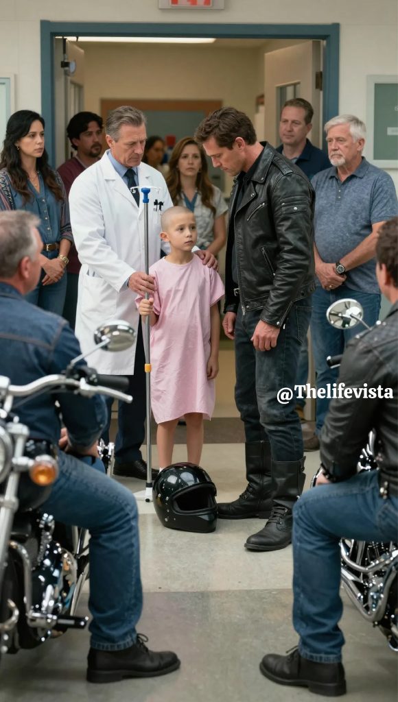 He knelt on the cold concrete just beyond the hospital’s sliding glass doors, his massive frame folded forward, shoulders broad and tense beneath a weathered leather vest that creaked softly whenever he shifted his weight. A battered motorcycle helmet sat beside him, scarred and dulled by years of hard miles and worse weather, the kind of helmet that told its story without words. Dark tattoos wound their way up his arms and vanished beneath the sleeves of a faded black shirt, and a simple steel cross hung low against his chest, catching the light each time he breathed.