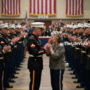 Lillian stopped at the only table with an empty chair. Ellie McKenna sat there alone, except for Atlas, the large retired K-9 lying quietly at her feet. Ellie had that unmistakable presence: short hair, strong jaw, eyes that did not invite casual conversation. She wore civilian clothes, but the Marine never truly leaves the body. Atlas wore a vest reading RETIRED – DO NOT PET, though most people ignored it.