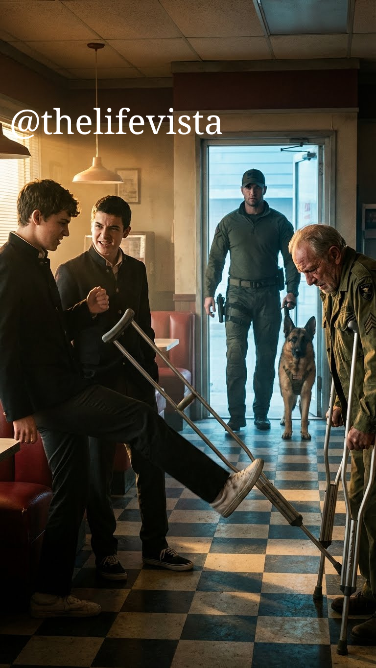An elderly war veteran walked into a small coastal diner, seeking nothing more than a warm meal and a quiet moment. A group of privileged teens saw his weakness as entertainment and pushed him to the floor. They didn’t know a Navy Seal and his German Shepherd were watching. Their mistake wasn’t the cruelty. It was awakening a sense of justice. God never lets die. Before we begin, tell us where you’re watching from. And if this story moves you, please subscribe for more.