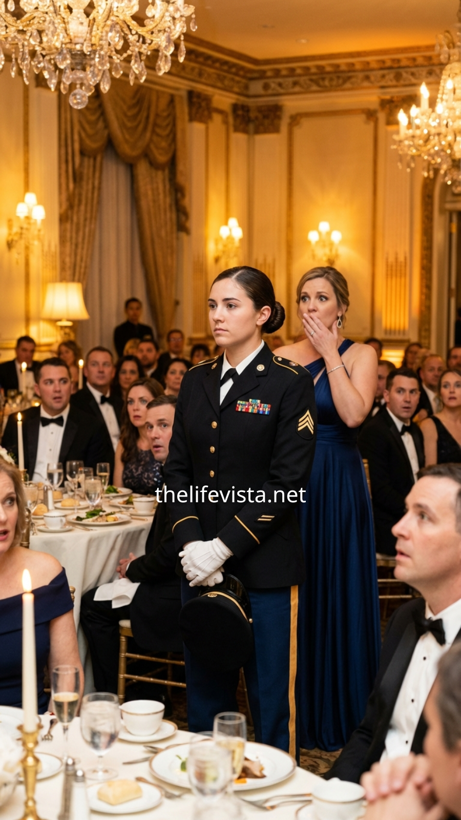 Across from her, her son Alex sat in full Navy dress blues, his SEAL trident catching the chandelier light. He didn’t smile. His jaw tightened, just slightly. I noticed because noticing things is my job.