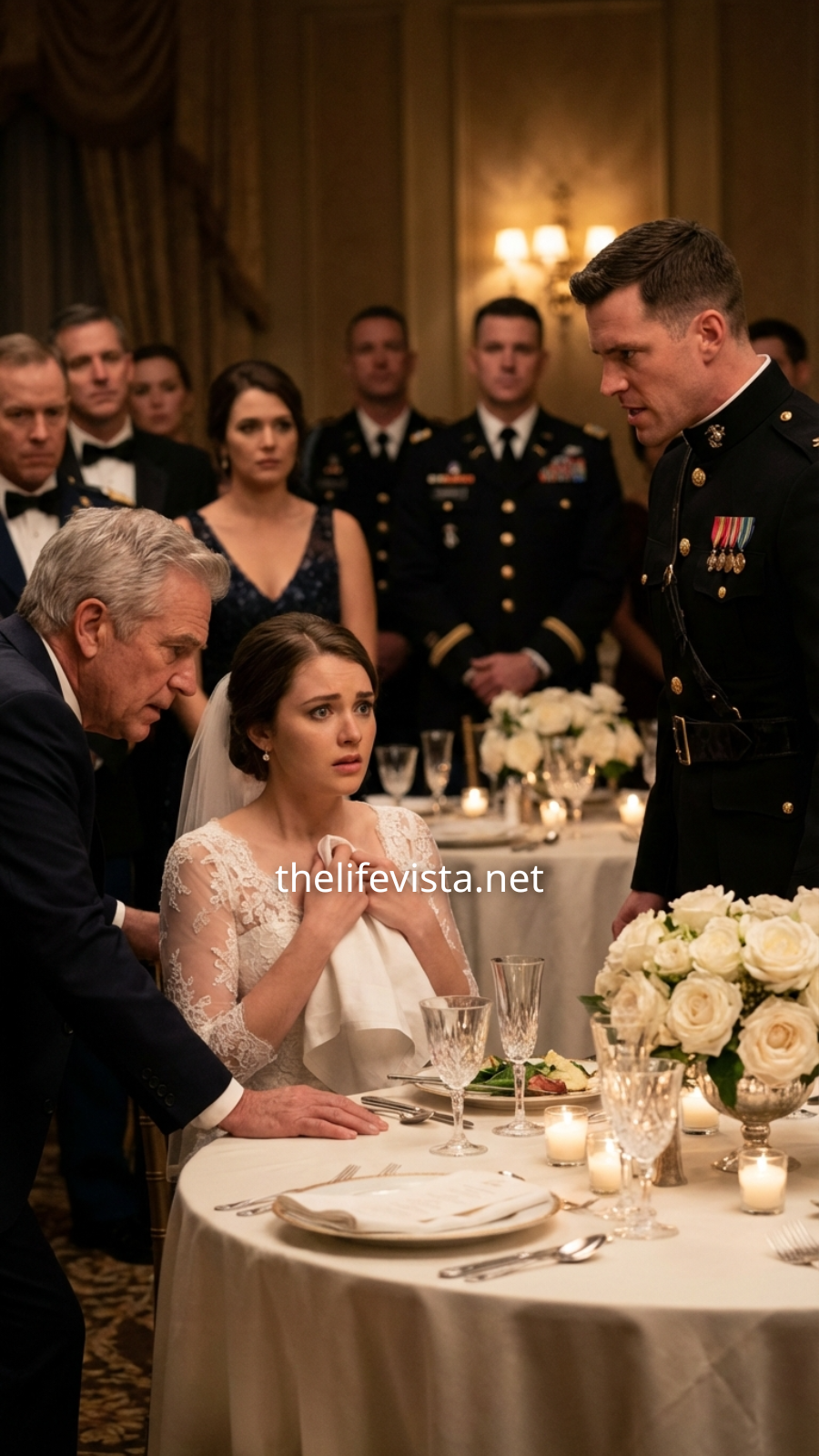She took one unsteady step backward before collapsing completely. Her knees buckled and she hit the polished floor with a sharp shriek, her wedding gown puffing around her like a deflated cloud.