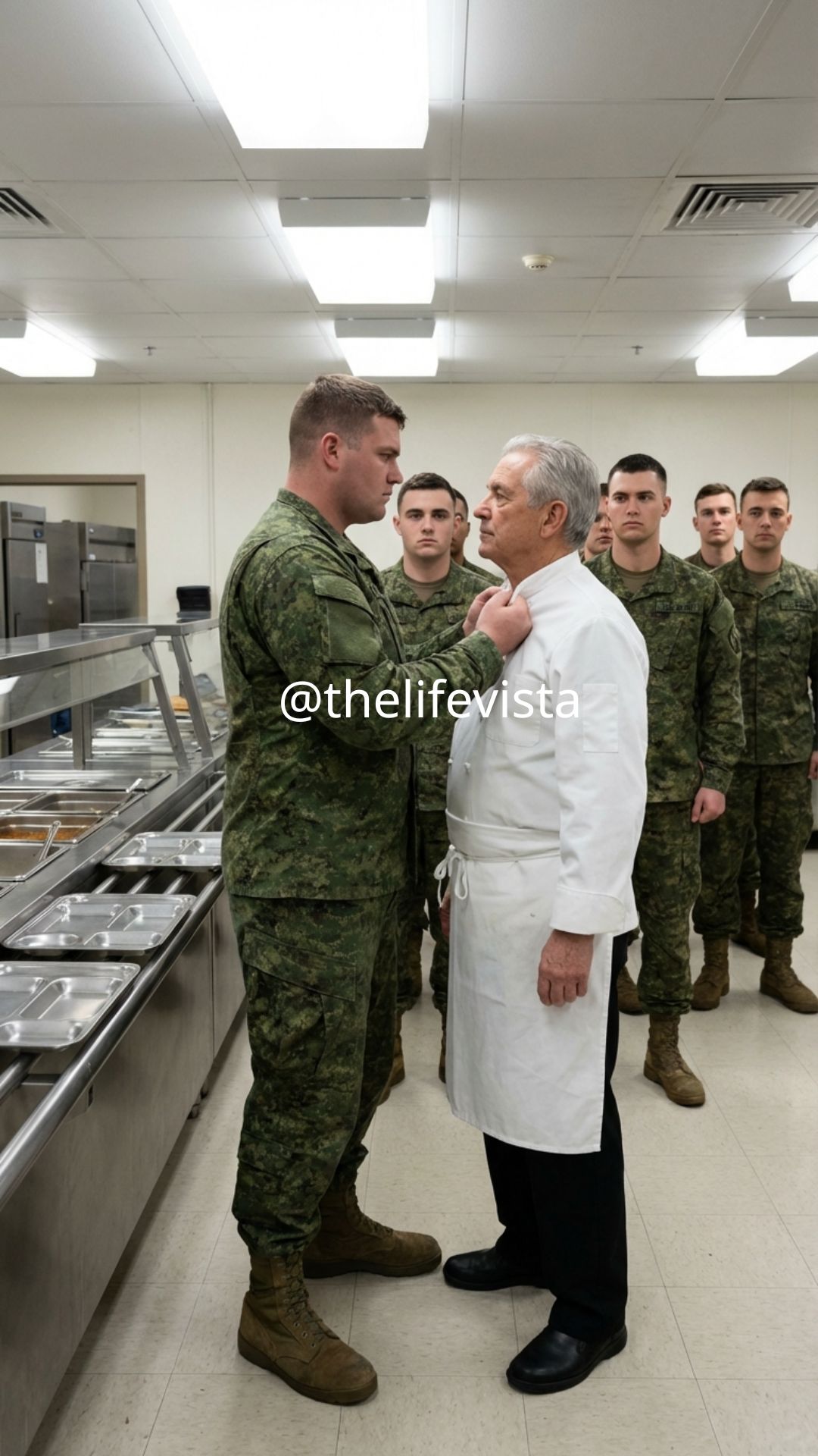 The Admiral stepped around the counter, entering the kitchen area—a breach of protocol so severe it made the aides behind him murmur in protest. He ignored them. He stood in the narrow walkway between the steam tables and the prep stations, looking at the industrial-sized whisks and the stacks of plastic trays.